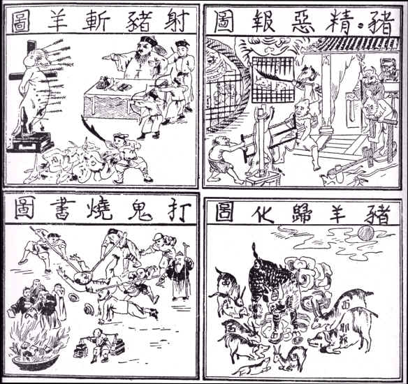 Boxerplakat gegen die Fremden, Gesamtsicht: Hinrichtung Jesu und anderer Ausländer, Höllenstrafen für Ausländer, Prügel und Bücherverbrennung und abschließender Sieg des chinesischen Qilin.