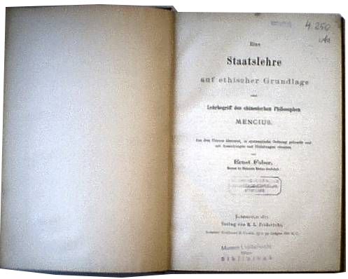 Ernst Faber: Staatslehre auf ethischer Grundlage oder Lehrbegriff des chinesischen Philosophen Mencius -- Aus dem Urtext übersetzt, in systematische Ordnung gebracht und mit Anmerkungen und Einleitungen versehen, 1877 |