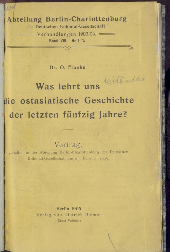 Otto Franke: Was lehrt uns die ostasiatische Geschichte der letzten fünfzig Jahre? Vortrag, gehalten in der Abteilung Berlin-Charlottenburg der Deutschen Kolonial-Gesellschaft am 23. Februar 1905 |