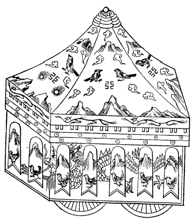 On the next page there is given a figure of the catafalque over the coffin as borne to the grave, copied from the second volume of P. Zottoli's work. A larger one, more fully illustrating the details of the text, forms the last plate in the Khien-lung edition of the Classic; but it is so rough and complicated that the friend who has assisted me with most of the figures that I have ventured to introduce shrank from attempting to reproduce it on a smaller scale.]